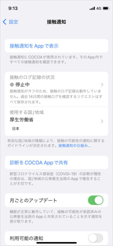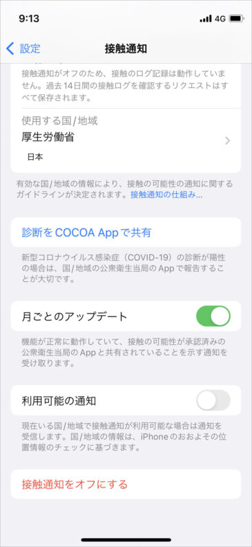 でもiPhoneの場合「設定」→「接触通知」を確認すると、「月ごとのアップデート」とか人によっては「利用可能の通知」とかONになってるんですよね。一番下にある「接触通知をオフにする」をタップするまでは、まだ微弱な電力は食うかも知れませんね。