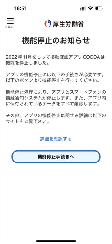 iPhone / iPad / Apple Watch2022/11/17に配信されたCOCOAアプリ最終版をインストールすると、OSレベルで機能停止して終了してくれるって言うじゃないですか。