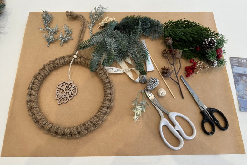 パーツ一式。これがどうやったらリースになるのか皆目想像が付きませんが、指導を受けまして、要は針金と接着剤でもう好き勝手作っていいと。