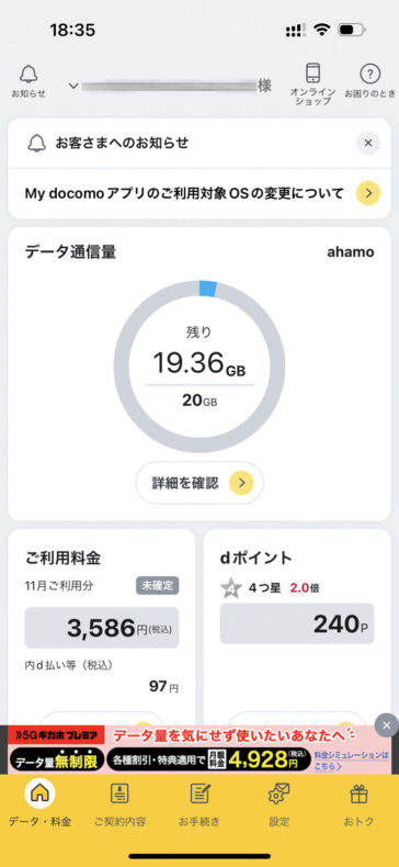 こう考えると娘もともかく、むしろ 5Gギガライトプランを使っている私も ahamo の方がいいような気がして、私が率先して人柱的に ahamo に切り替えてみました。