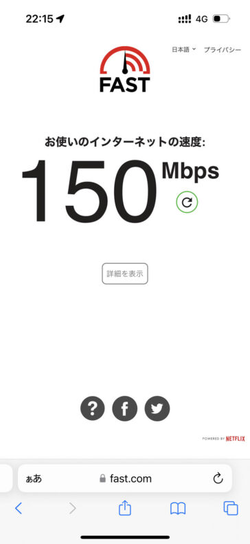 駅前で測定。4Gエリアですが 150Mbps 出れば充分でしょう。