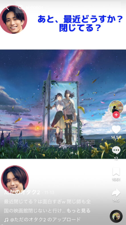 あまりアニメを観ないジャニヲタの娘が「すずめの戸締まり」を観に行ったきっかけは、TikTokでした。TikTokにラジオを転載している人がいるんですね(違法だと思いますが、版権側も利益になるので目を瞑っているのだろうと思います)。そこでSixTonesのラジオが転載されていて、私も聞いてみたんですが、これは確かに面白い…