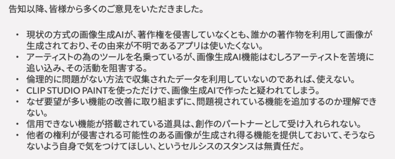 思うに、CSPでの作品作りをリードしている側にこういった意見が強くなりそうですね。逆に私みたいにCSPにリードされている(CSPに使われている)側の人間はAI搭載に肯定的なんだろうと思います。