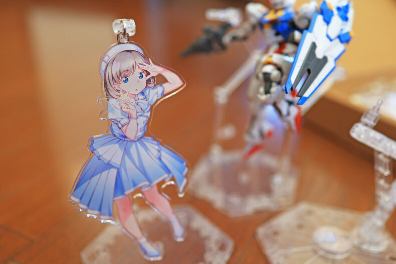 アクキースタンドはそれこそ百均など含めて販売されていますが、こういった大型のアクキーには対応していないものが多いので、このようにプラモ/フィギュア用のスタンドを転用するのもアリなのではないかと思います。