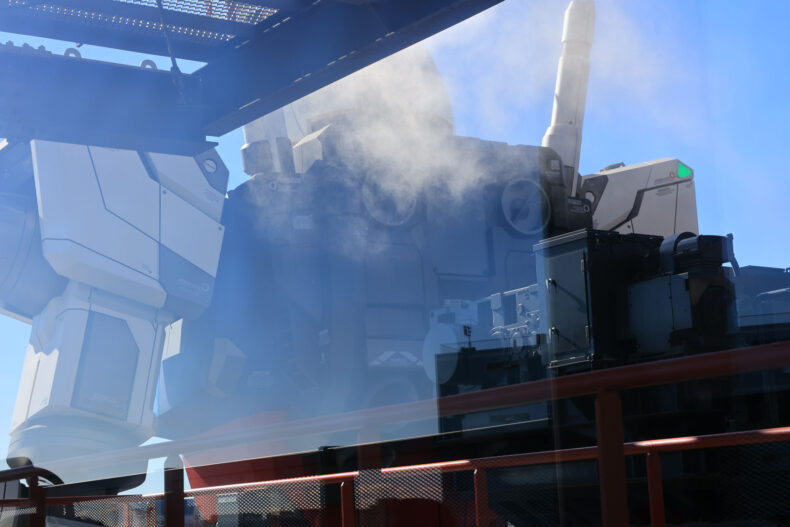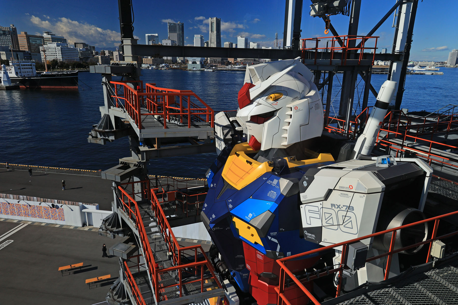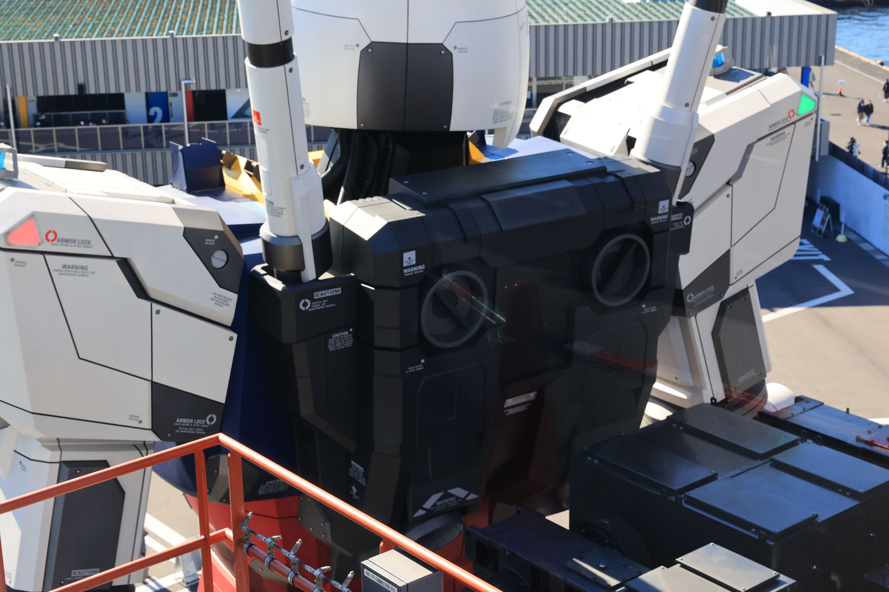ドックタワーのスタッフは、1Fの誘導の比較的年齢が高めのおじさんは撮影のアドバイスや場所取りのノウハウを親切に教えてくれたのですが、いざ登ってみると5F/6Fの現地にいるスタッフの指示が、1Fで聞いた話と流れが違っていたり、やたら不平等だったり、本気で撮ろうとするとかなり運を天に任せる要素が高くなります。行列の先頭ならばある程度撮影できる絵は予想が付きますが、実は先頭に並んでいたのでは「ガンダムが上半身をドック側に向けたポーズ」は観覧者のローテーションのタイミングの都合で撮影できないのです。