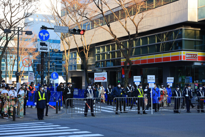 会場の横浜アリーナは1ブロック手前の区画から入場規制、ここから各種セキュリティチェックが入ります。振袖に武器を隠していないかもチェックされるのだそうです。振袖に武器とか萌え要素じゃないですか…(不謹慎)。