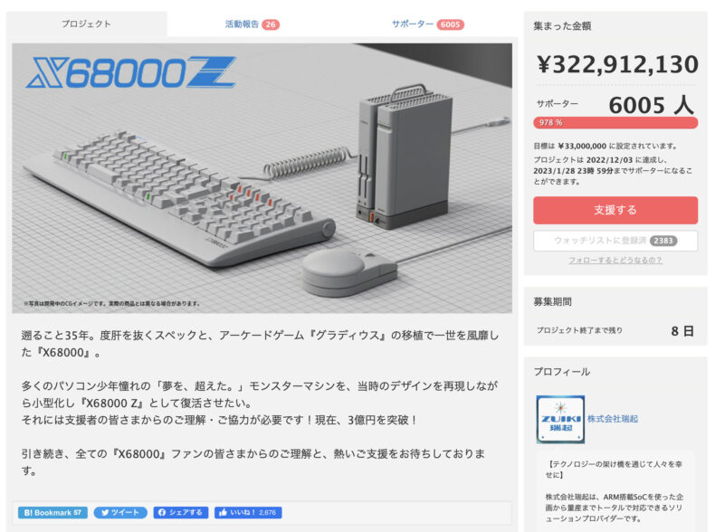 2.75億くらいで終了ではないかと予想していたX68000Zクラウドファンディング、お正月明けにググッと伸びて、さらにグラディウスが動いている動画が公開されるとさらに伸びて、あっという間に3億円を突破。「目標金額の10倍に迫る」とも言われていますが、元々目標金額は低めに設定していたとのことなので、10倍という数字にはあまり意味はないでしょう。