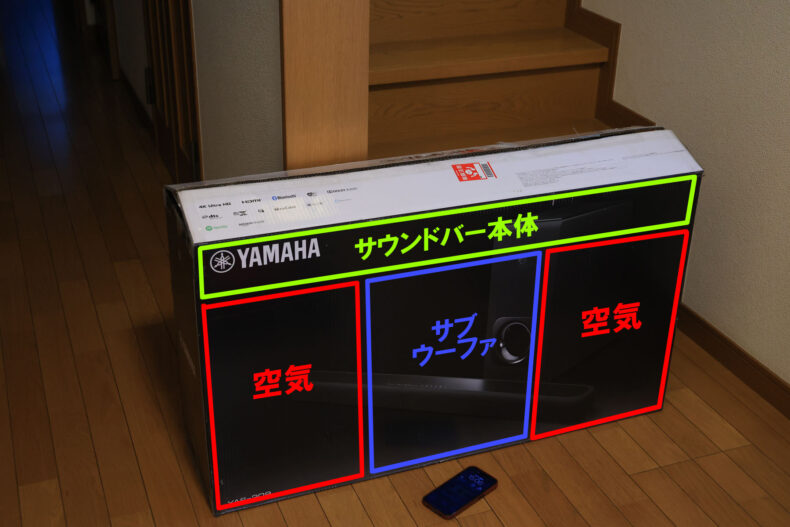しかもですよ、商品は「細長いサウンドバー」+「スーパーウーファー」という構成なので、中にはこんな感じで製品が収まっていました: