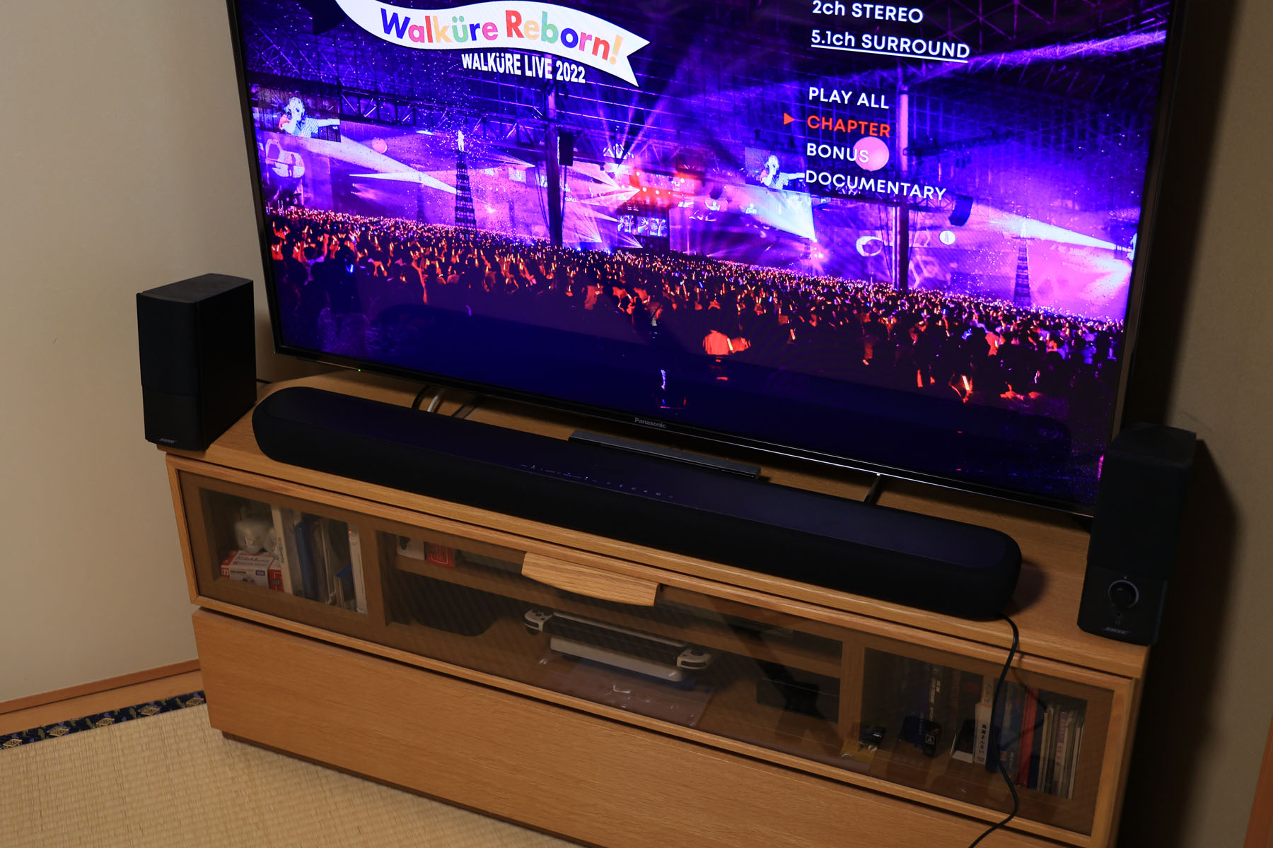2ch再生でもサウンドバーの設定を「サラウンド」にすると、ヤマハお得意のDSP技術でそれなりにスピーカーの幅を超えて広がりますが、5.1ch再生にするとさらに部屋全体が音で満たされている感があります。とはいえこれはDSP技術による耳の錯覚なので、テレビの正面を離れると部屋中が音で満たされていないことは分かります。でもまぁ、ワイヤードのリヤスピーカーは配線が面倒だし、完全ワイヤレスのリアスピーカー付きのセットはお値段がこの10倍くらいするし、2.1chスピーカー構成でこれだけ広がって聞こえれば良いでしょう。