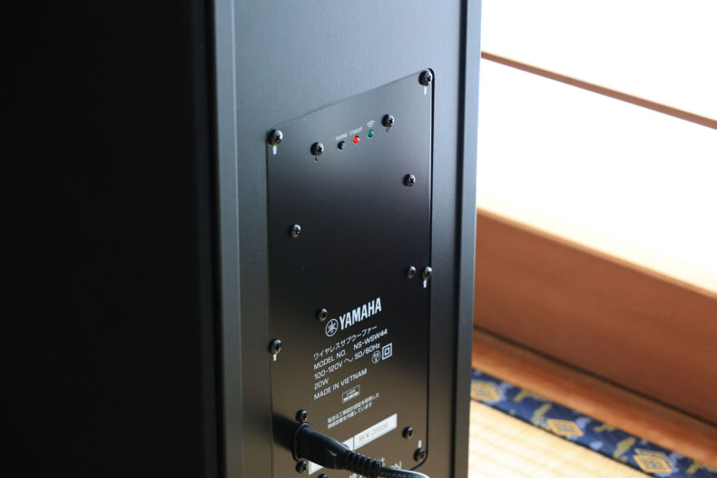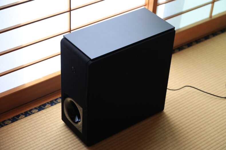 本体とは独自規格のワイヤレス接続で、一瞬で繋がります。Bluetoothのような接続まで数秒かかるということはありません。電源が確保できる場所であればどこにでも設置可能ですし、サブウーファーなので部屋の邪魔にならないところにでも置こうかと思ったのですが、試したところ意外とクロスオーバー周波数が高いようで、たとえば部屋のテレビと対角方向の角に置いた場合には音像がかなりぼやけてしまう(音が部屋中でぐわんぐわんしてしまう)印象を持ちました。結局はテレビの横に無理やりでも場所を作って置くのが良さそうです。