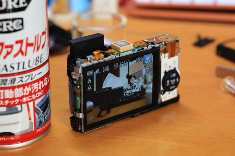 ストロボユニットを自由にするには、液晶パネルの下にあるネジを外さなければならないので、液晶パネルを外さねばなりません。液晶パネルを外すには、背面側キー基板と上面外装も外さなければなりません。