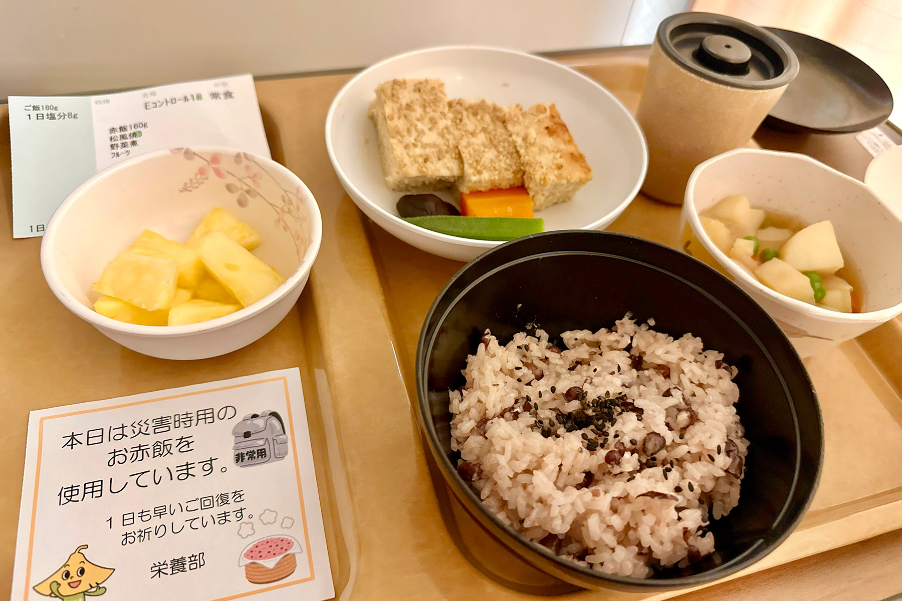そんな中で一番美味しかったのがこれ。赤飯と松風焼きです。災害備品活用(ローテーション)とのことでしたが、これはかなり普通の食事に近かったです。違いは赤飯に乗っているのが「ごましお」ではなく「ごま」ということくらいです。ちょうど手術傷が快方に向かってきたという実感があったときの食事だったので、精神的なアシストも大いにあっただろうと思います。なお、最後まで揚げ物は出なかったですね…。
