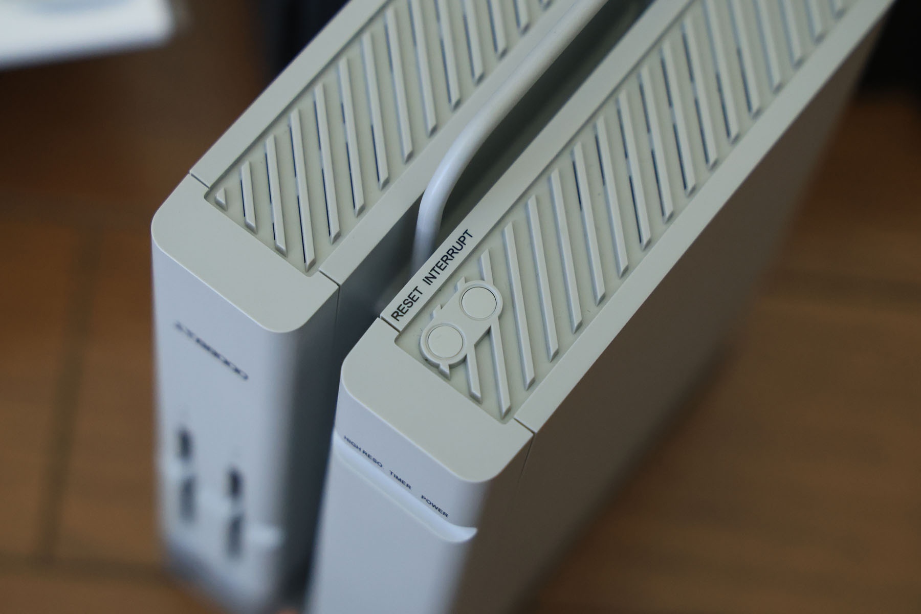 天面のリセットとインタラプトスイッチ。ダミーではなく機能します。インタラプトスイッチはリセットせずにシステムを止める(割り込みを入れる)スイッチです。ポップアップハンドルは何かの感触に似てると思ったら、ガンプラのランナーです(笑。