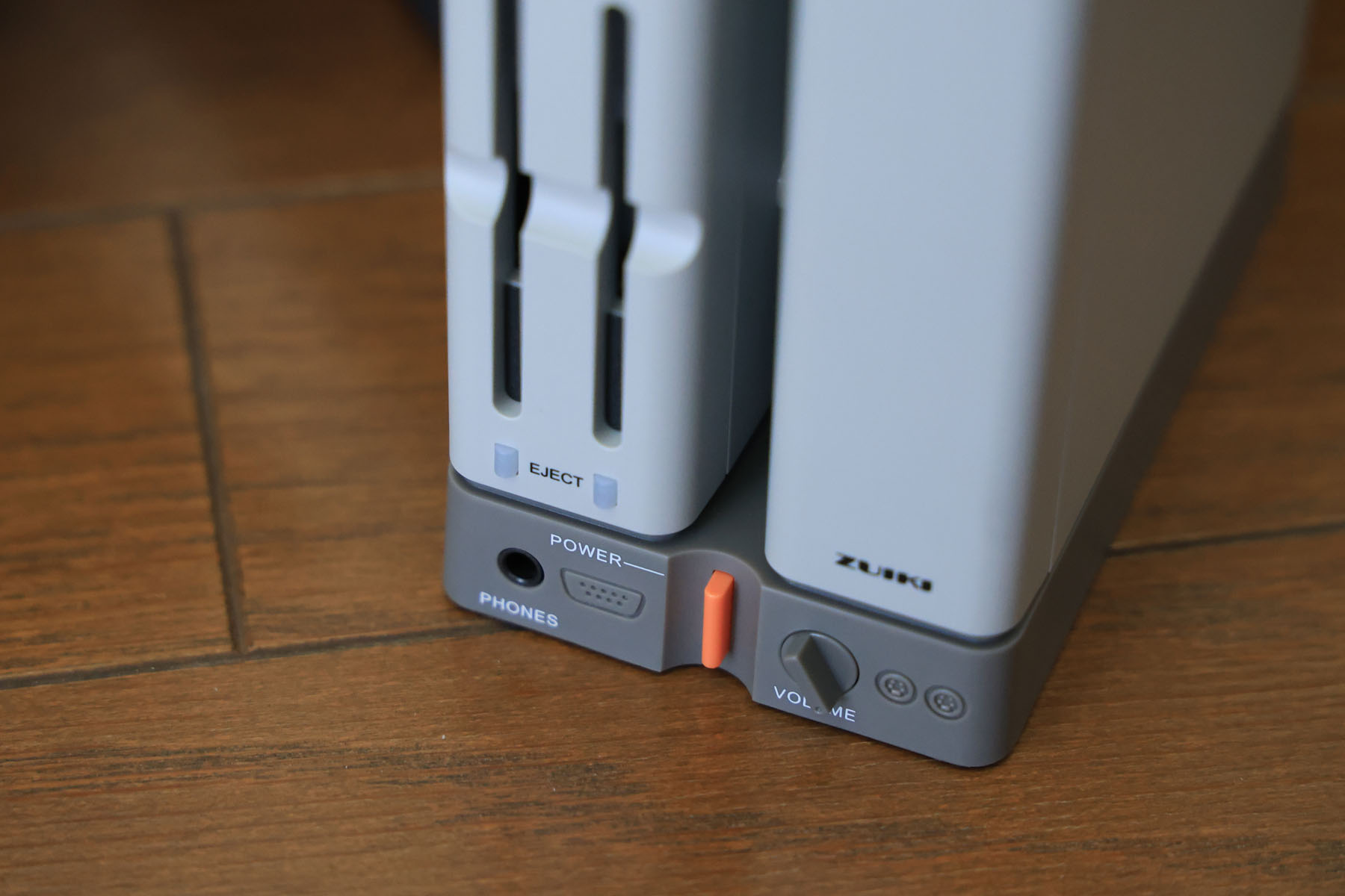 電源スイッチ、ヘッドホン端子、ボリュームツマミです。すべて機能します。なおボリュームツマミは本体内蔵スピーカーの音量調整に効きます。