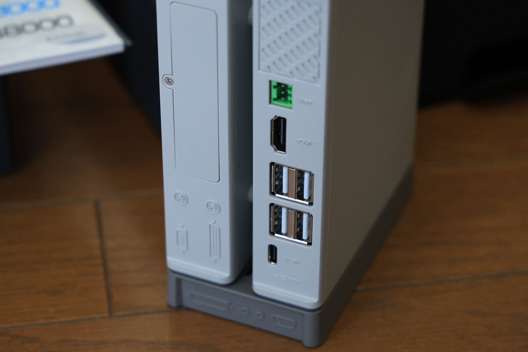 背面。電源はUSB-Cです。RS-232C代わりのUART端子(緑色)があり、ケーブルも付属します。非同期式のシリアル通信ができます。