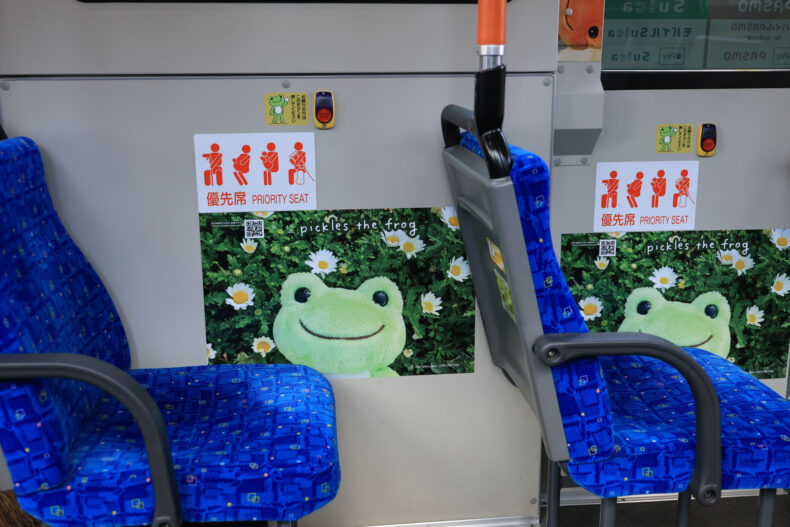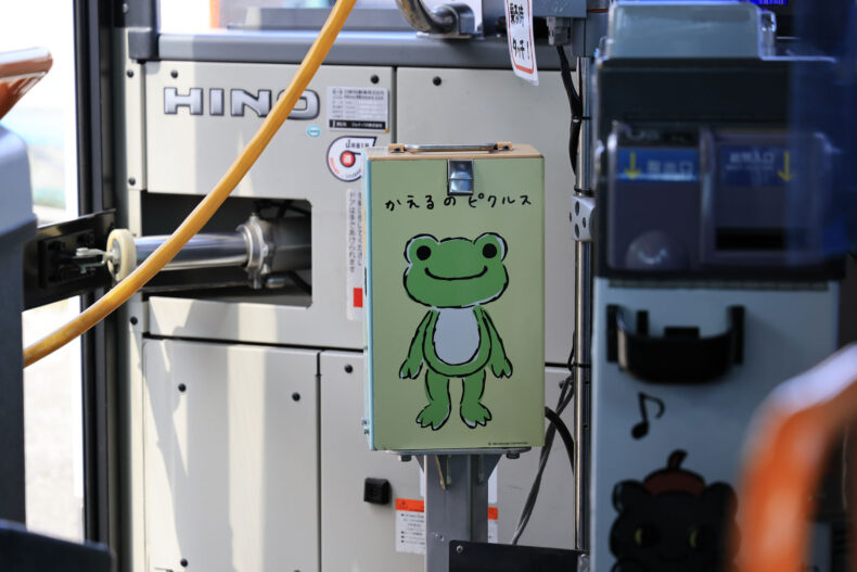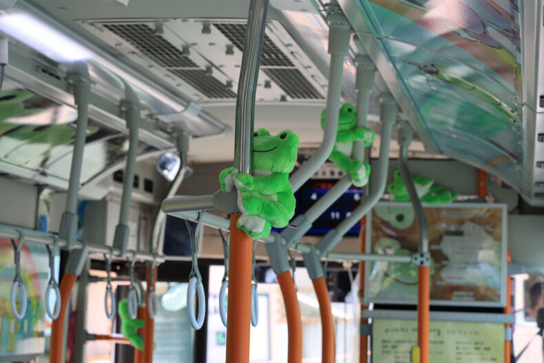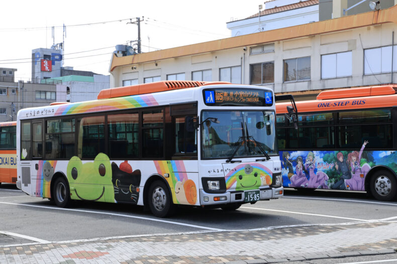 いるじゃんカエル! 奥には「あまんちゅ!」のコラボバスも。いろんなコンテンツとコラボしてるんですね。ラブライブ!のバスもこの会社だったしなぁ。