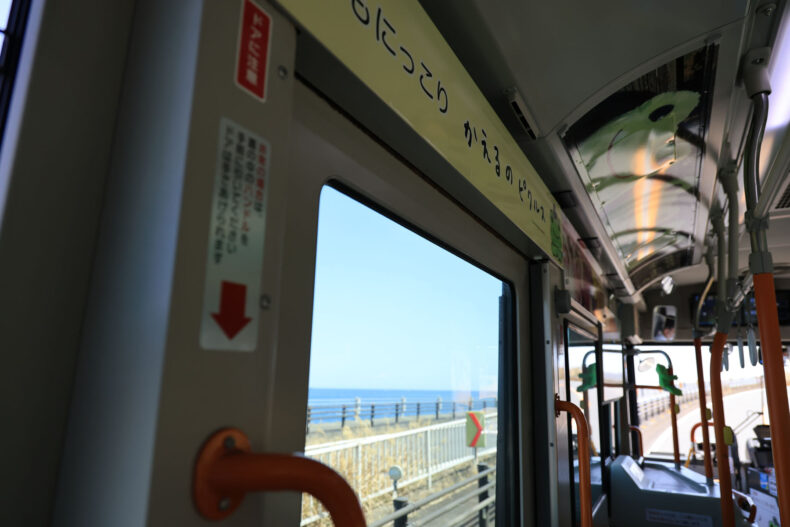 駅から少し走って、海沿いに出たところあたりで車内に「かえるのピクルス」(リベルリラ)の曲がかかって癒しは最高潮に。