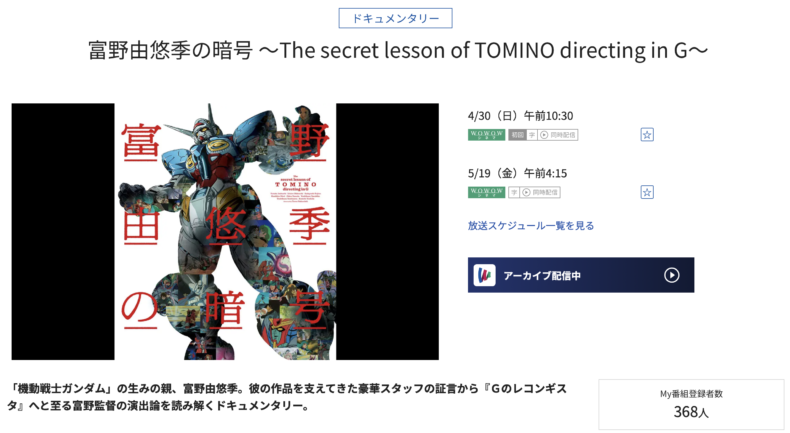 GWはガンダムウイーク?なのか、WOWOWやスカパー!ではいろんなガンダムが一挙放送。特に注目したのが、TV初放送となる「富野由悠季の暗号〜The secret lesson of TOMINO directing in G〜」です。「劇場版・GのレコンギスタV」が封切られた際に全国の映画館で5,000枚限定/7,700円で販売された映像。相模原のイオンシネマでは全然手に入りませんでした。今メルカリでは中古が1万円越えで販売されており、放送されるのは本編だけとはいえディスクの価格と比べればWOWOW視聴料は安いものです。更にそれに続いて「Gのレコンギスタ劇場版 I〜V」も放映されるので、録画しない手はないでしょう。これは1ヶ月だけWOWOW契約決定です。
