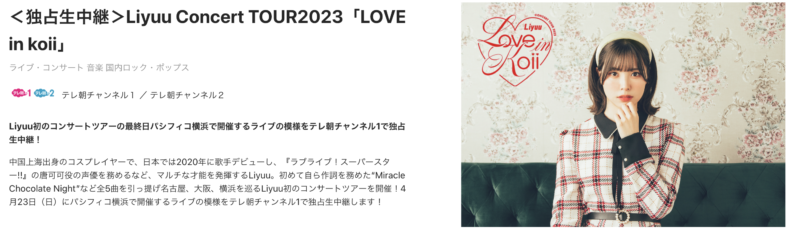 ほかにスカパー!方面もチェックしていたら、ガンダムではないんですが同じサンライズ繋がりで「ラブライブ!スーパースター!!」の「唐可可」役のLiyuuさんの単独ライブ2023 at パシフィコ横浜の生中継があるじゃないですか。放送は録画じゃなくて、ライブビューイング。スカパー!も1ヶ月で1,500円かかりますが、これは悩む。Liella!ならともかくLiyuuさん単独の円盤を買うほどのファンではないものの、唐可可はキャラがいいなぁと思っています。生中継のライブ感は抗いにくいものはありますし、しかもいつも目の前を通ってるパシフィコ横浜。音響は決してよくありませんが。
