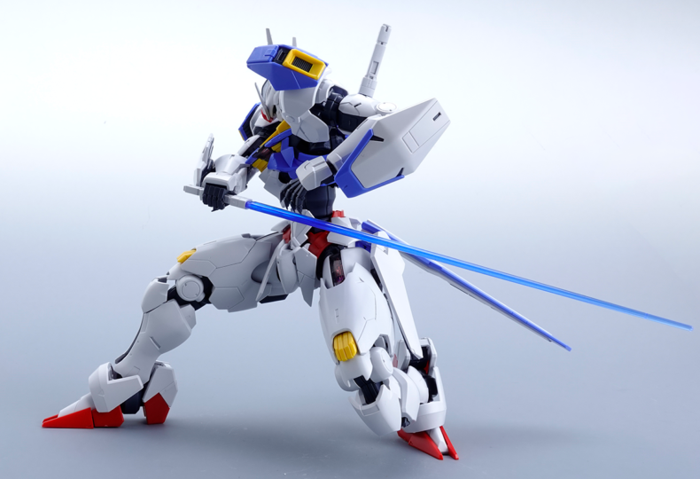 さてフルメカニクス エアリアルですが、カラー成型はほぼ完璧で、グリーンの目、シールド中央の青いビットの縁取りの白い部分(1/144ではシール対応だった)、踵中央のグレーのフィン状の部品など、1/144では気になっていた色分けがほぼ完璧になされています。コクピット両側の機能不明な色の付いたビーム発射装置のようなパーツは色分けがない上シールにも見当たらず、そこはどうした?という気はしないでもないです。