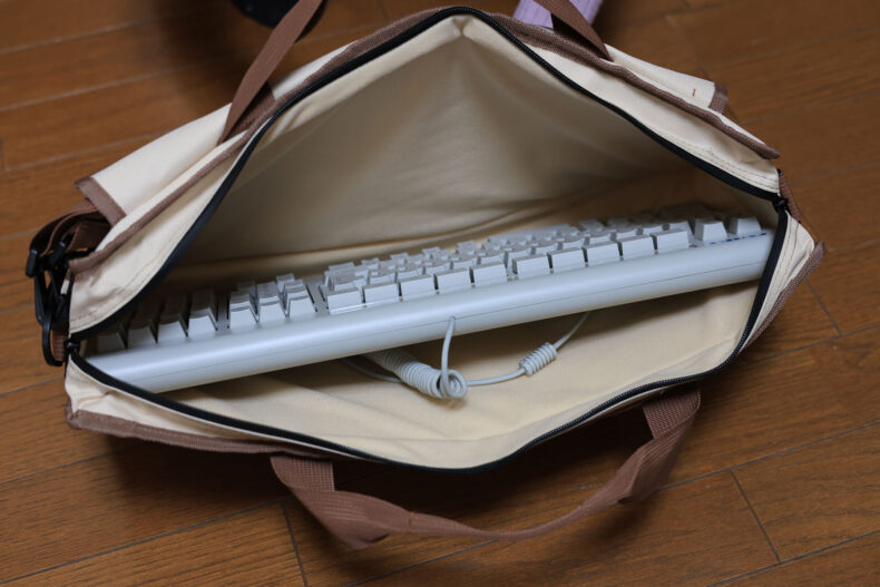 サンワサプライ キーボード用バッグ BAG-KB01BK も試したのですが、ケーブル引き出し部分が微妙に収まらず、小さかったですね…(返品させていただきました)。