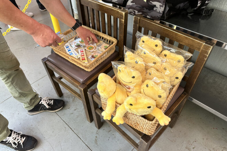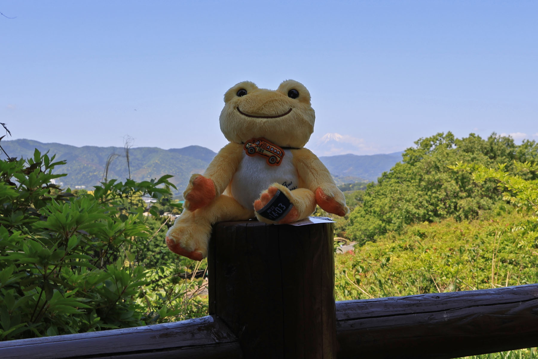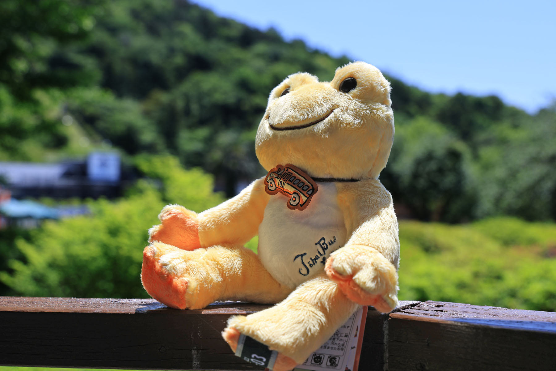 終着バス停である「小室山リフト」はレストハウスが工事中で買物ができません。伊東駅の東海バスの窓口でレストハウスで売ってたものはどこかで買えないのかと尋ねたところ、「基本的には買えないが、かえるのぬいぐるみなら小室山リフト乗り場事務所でかえる」とのことで「それです!それ!」と小室山リフト下事務所に直行。「あのう…」と声を掛けるとかえるを出してくれました。「1つ1つ表情が違いますので、好きなの選んでください」と。分かっていらっしゃる。