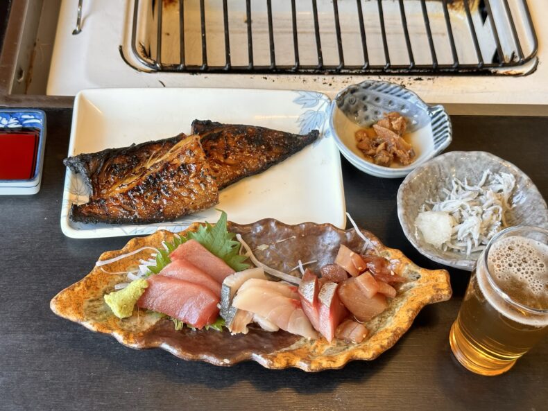GWですので渋滞に巻き込まれて帰宅が遅くなるのを避けるのに早々に離脱。帰りに熱海の「ふじいち」でお昼を頂きました。写真は日替わり定食で1,620円(ノンアルビールは別売)、これにご飯とあら汁と漬物が付きます。熱海のこういう定食って2,000円〜3,000円するイメージなのですが、こういった魚屋さん直結のお店だととてもいい感じです。もちろん味も素晴らしく、なんてことがないように見えるマグロ刺身がトロっぽくて美味しかったです(これマグロなんだろうか…?)。駐車場の台数が少ないのだけがネックですが、ここはまたリピートしたい店でした。
