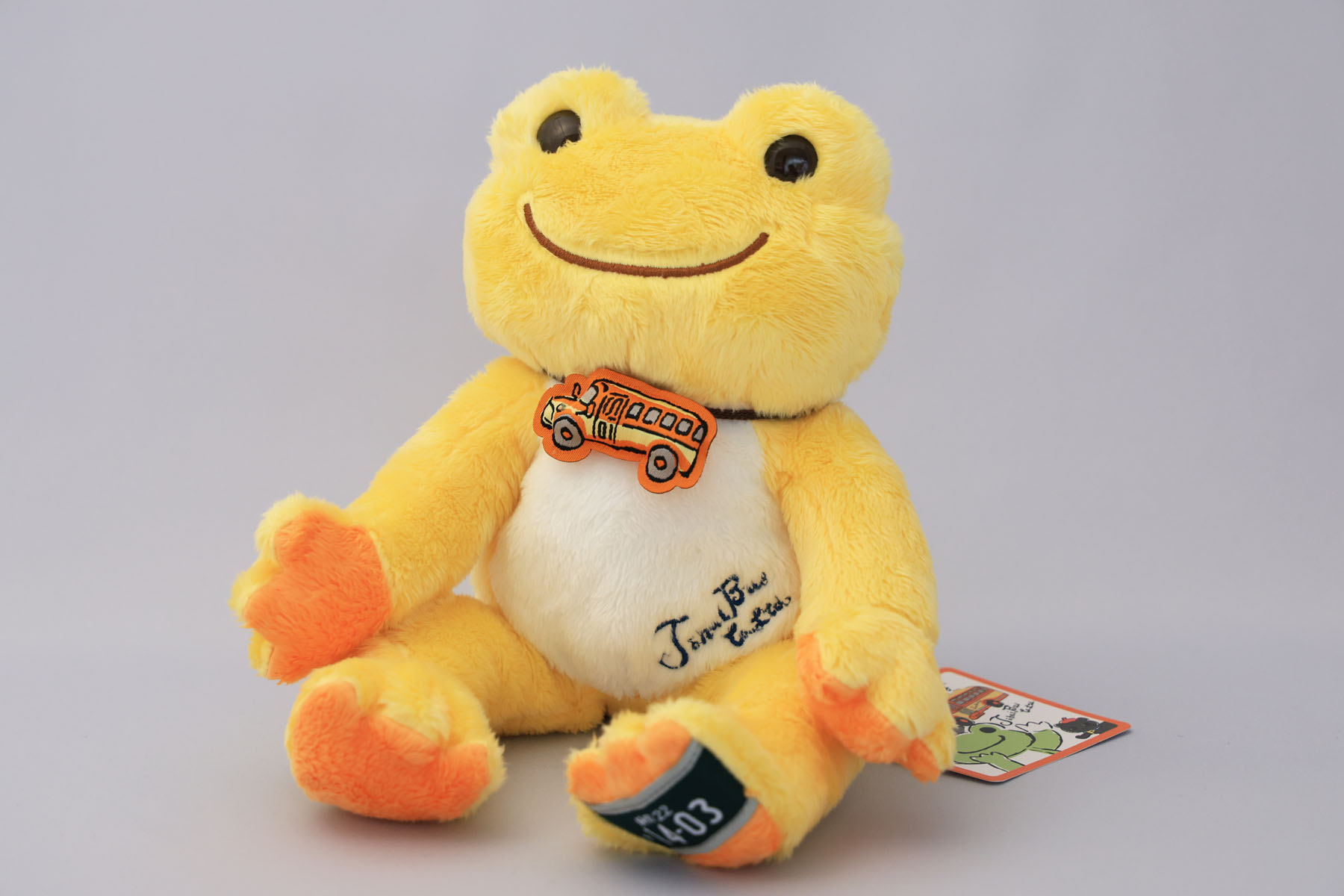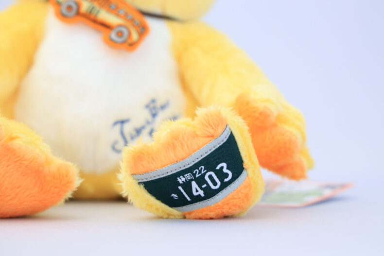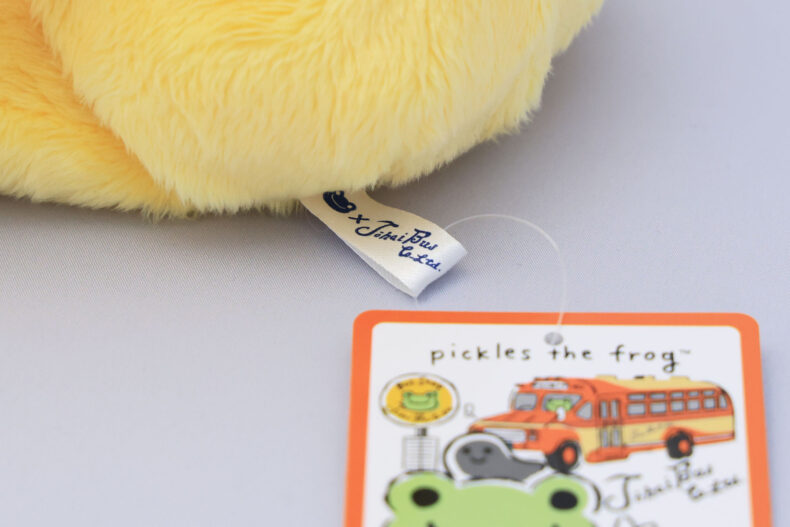 さて、おむかえるしたかえる、ピクルスですが、体全体は東海バスのシンボル的存在であるボンネットバス「伊豆の踊子号」をイメージしたカラーリングで、足の裏にはナンバープレートが刺繍されています。