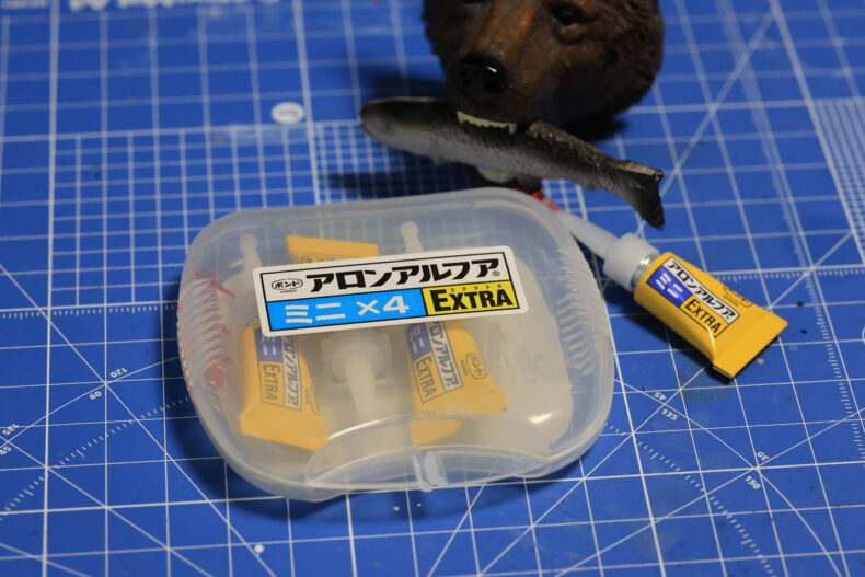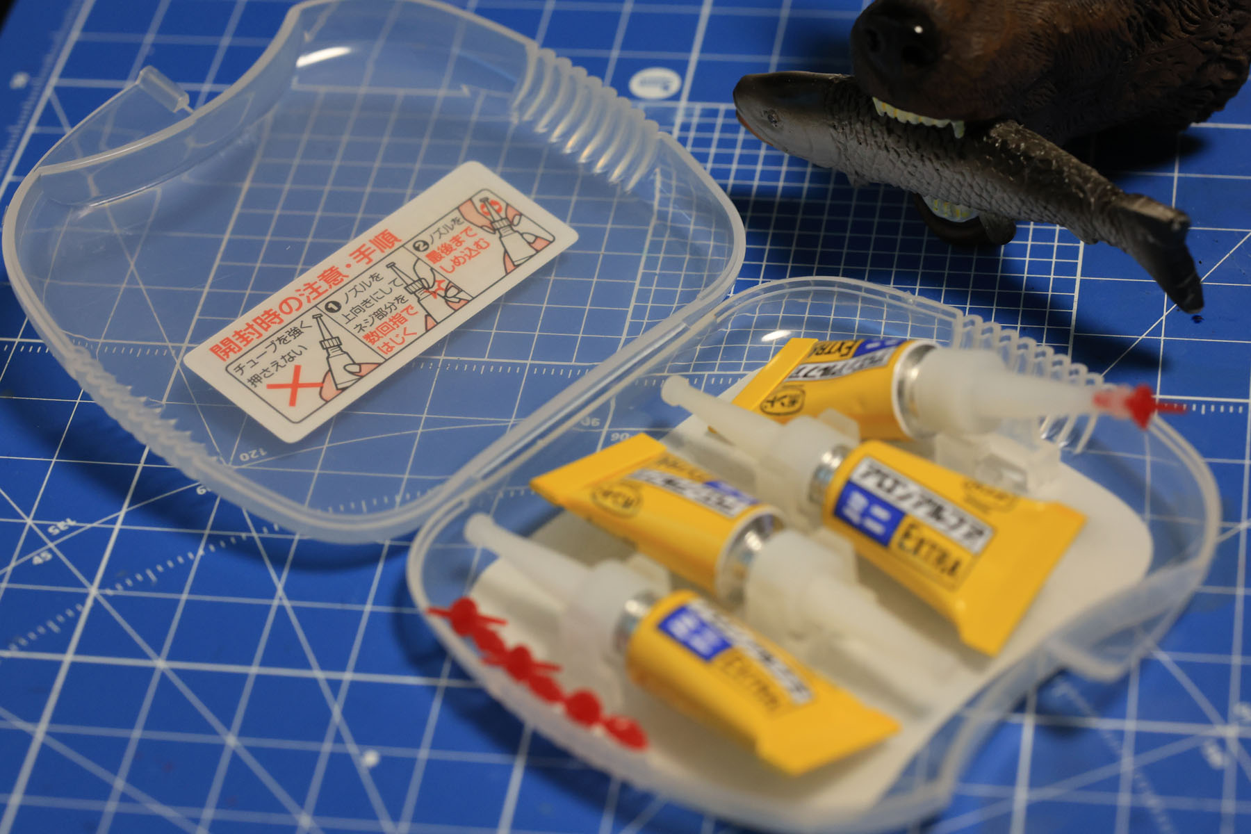 赤い部品は破棄用のキャップ。保存のためのキャップは付属しませんので一度封を切ったら終了です。ですが、大容量の瞬間接着剤は一度開封したら使い切っていないのに固まってしまうことが多々あり、使った回数あたりの単価を計算するとこういった使い切りタイプの方が安かったりします。