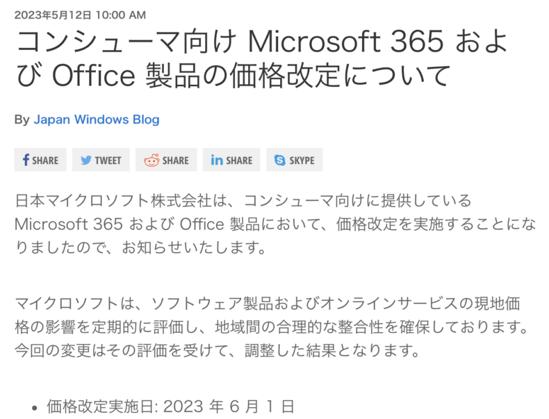 Microsoft 365 (Office 365) 6/1より15%値上げ PC一般 2023.05.17 Microsoft 365 (旧称 Office 365) が6/1より値上げになるようです。 私が使っている Microsoft 365 Personal 12ヶ月版は、11,800円から13,545円へ。約15%の値上げです。しかしながら、不定期(主に年末頃)に20%程度のキャッシュバックキャンペーンもやることが多いので、そうすると値上げ後でも現在の価格よりほんの少し安いことになります。悩ましいところです。でもキャッシュバックは必ずやるとは限らないし、オンラインコード買っておきますかね…。