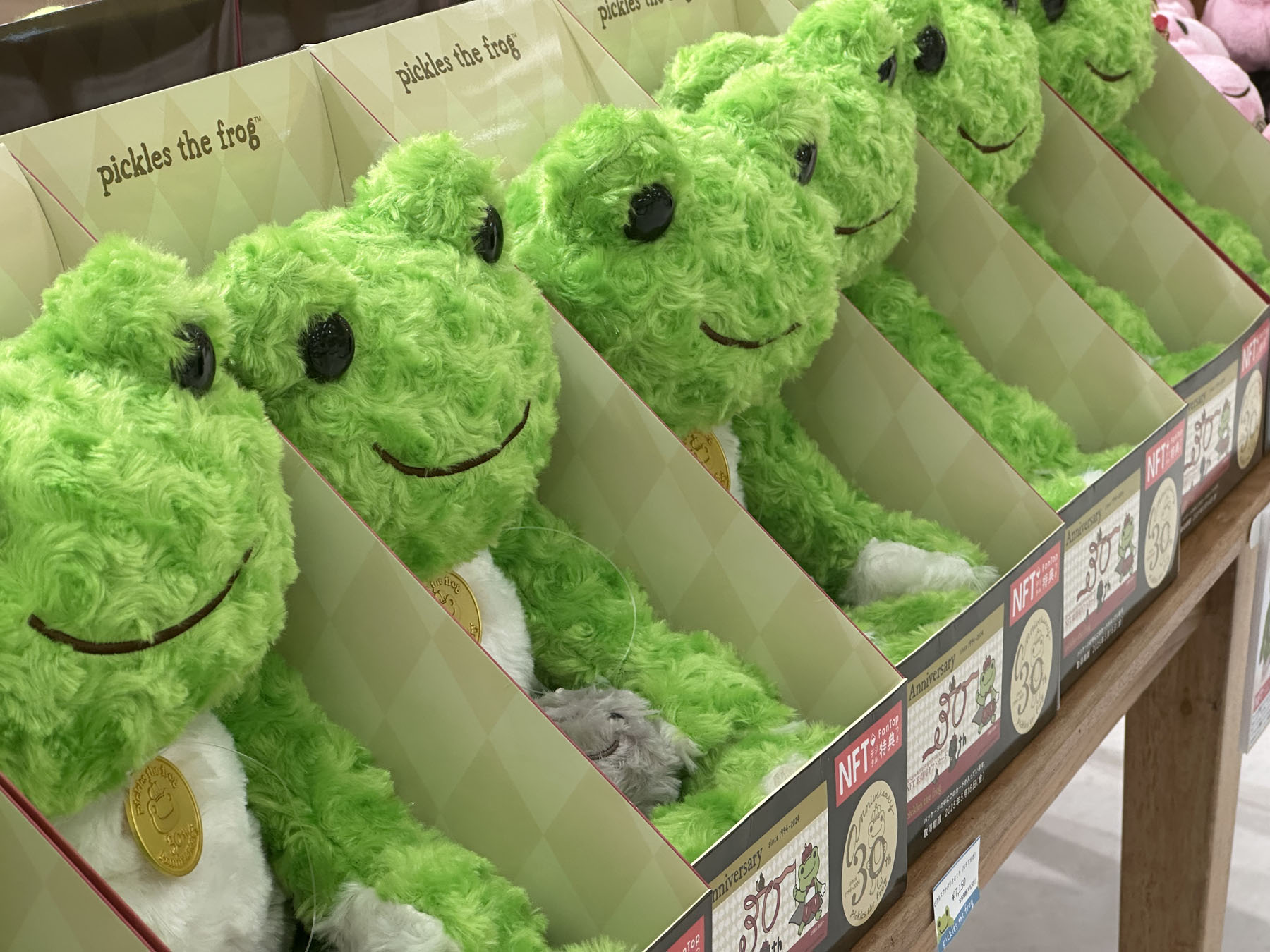 NFT ARアクリルスタンド付きピクルス。流行り物に乗りましたね。ARにした段階でアクスタでなくても良いと思いますが…。ぬいぐるみのサイズは普通のビーンドールより一回り大きいです。オタマジャクシ付き。
