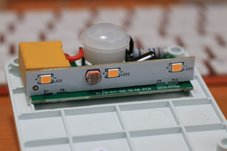 バラしてみるとチップ型LED3個と、CdS(光導電セル、光センサ−)が並んでいました。チップ型LEDは左右の2つが白色、中央の1つが電球色でした。全部電球色かと思っていたら違うようですね。