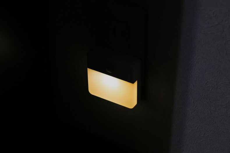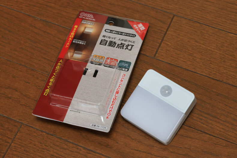 妻が真っ暗にして寝るのが好きな人なので、先に寝られてしまうとベッドに辿り着くのが一苦労。ここ数年はiPhoneのライトを点灯して指で覆って暗くした明かりを頼りに歩いていましたが、それも疲れたのでセンサーライトを買いました。780円くらいです
