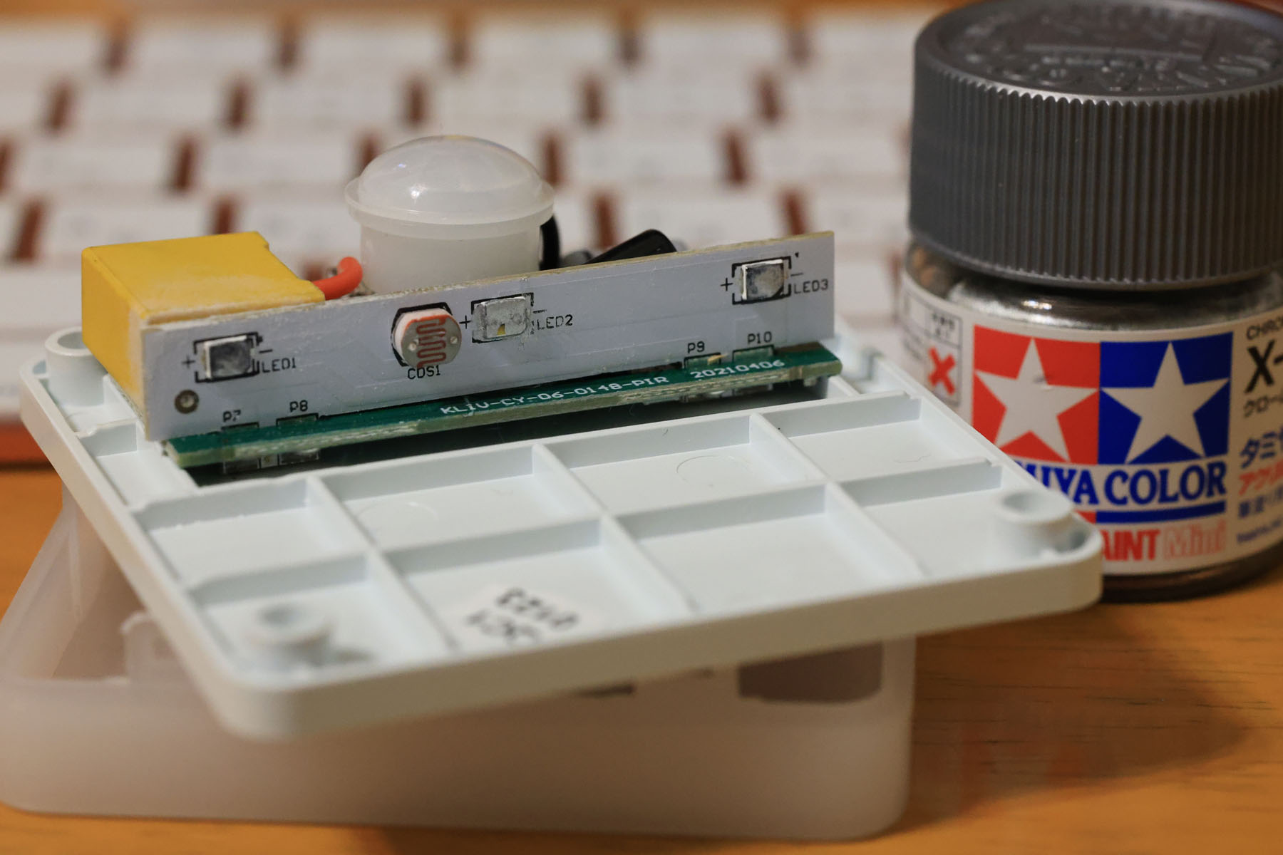 最初ケース自体をマスキングしてみたのですが、そうするとCdSに入る光の量も減ってしまうので、「明るいときには動作しない」という制御ができなくなってしまいます。それではイマイチなので、チップそのものを暗くするよう改造します。