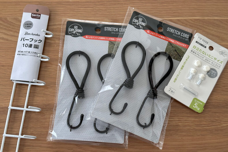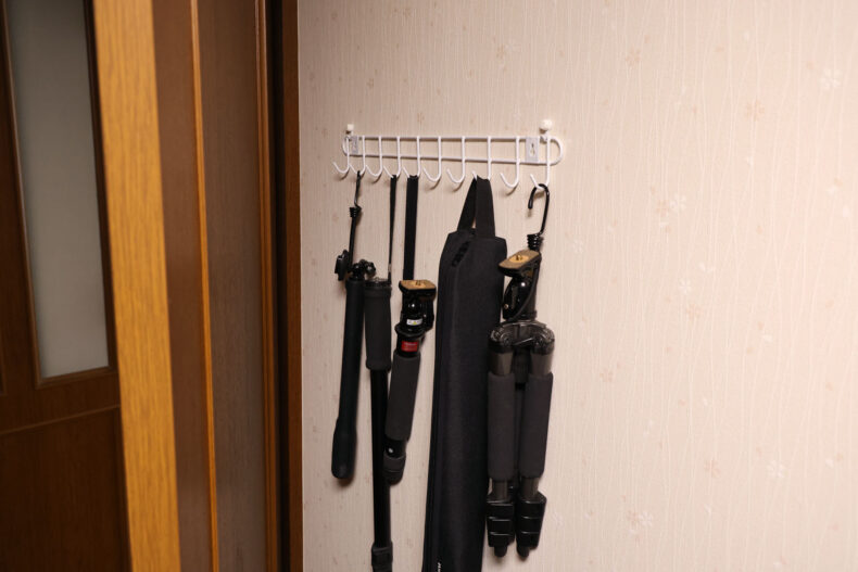 一脚とか短い三脚をクローゼットの足下に立てかけていたんですが、何かの拍子にバタンバタンと倒れるのでどこかに吊り下げたく、場所を作りました。傘立てとか買おうかとも思ったんですが、傘立てだとそれごと倒れそうな気がして、吊り下げて収納することにしました。