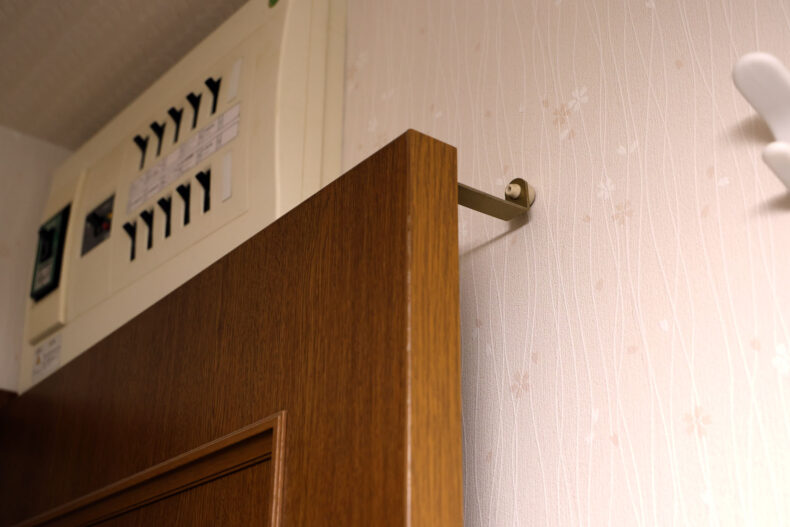 ドアにはストッパーが付いていて全開しないので、壁との間にデッドスペースがあるのです。上の方に配電盤があるのはここがリフォーム前は2階の脱衣場だったからです。