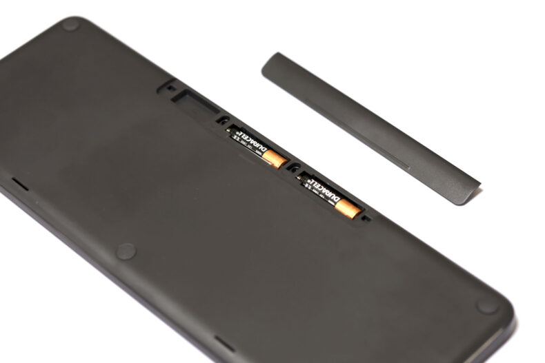 電池は単4電池2本。USBドングル用の収納凹みもあります。角度調整機構は特にありません。両手に持って使うか、膝の上で使うことを想定しているからだと思います。