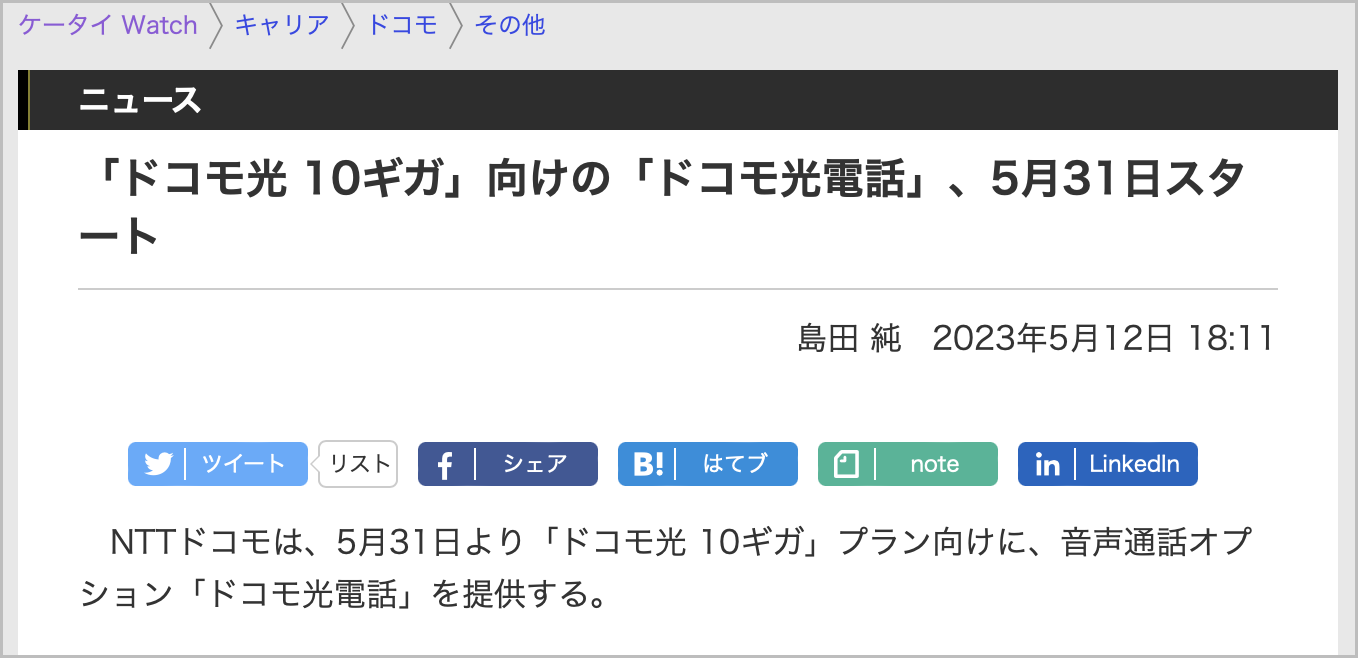 ケータイWatch:「ドコモ光 10ギガ」向けの「ドコモ光電話」、5月31日スタート