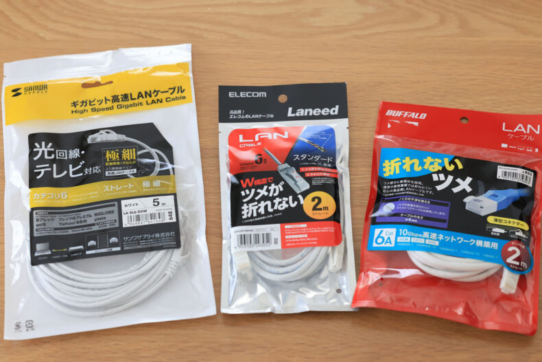 左から、細くていいので5m(テレビ用)、Cat.6の2m(2階への中継コンセント接続用)、Cat.6Aの2m(ドコモ光から提供される10GbE機器に接続する用)。