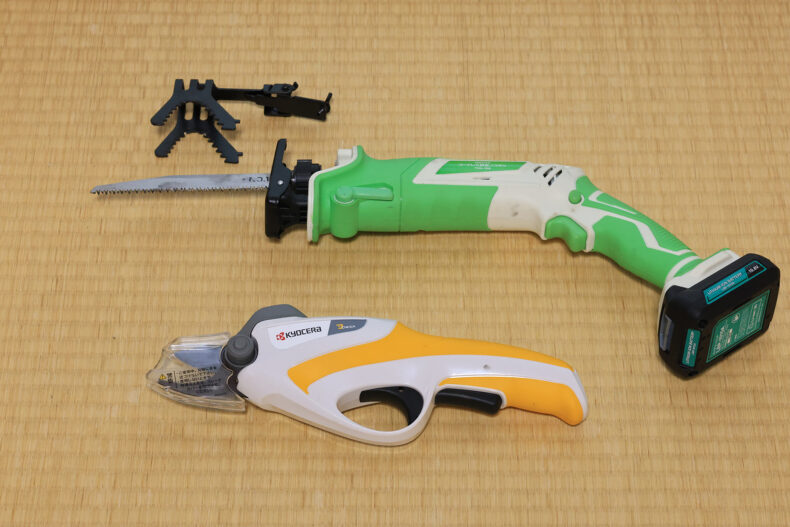 ボサボサになった庭木を何とかしようと、「京セラ(旧リョービ)充電式剪定ばさみ BSH-120」と、「山善 コードレス剪定のこぎり YSN-108」を購入しました。いままでノコギリも剪定ばさみも手動のものを使っていましたが、いかんせん使ったあとの疲れがハンパなく、電気の力を借りることに。