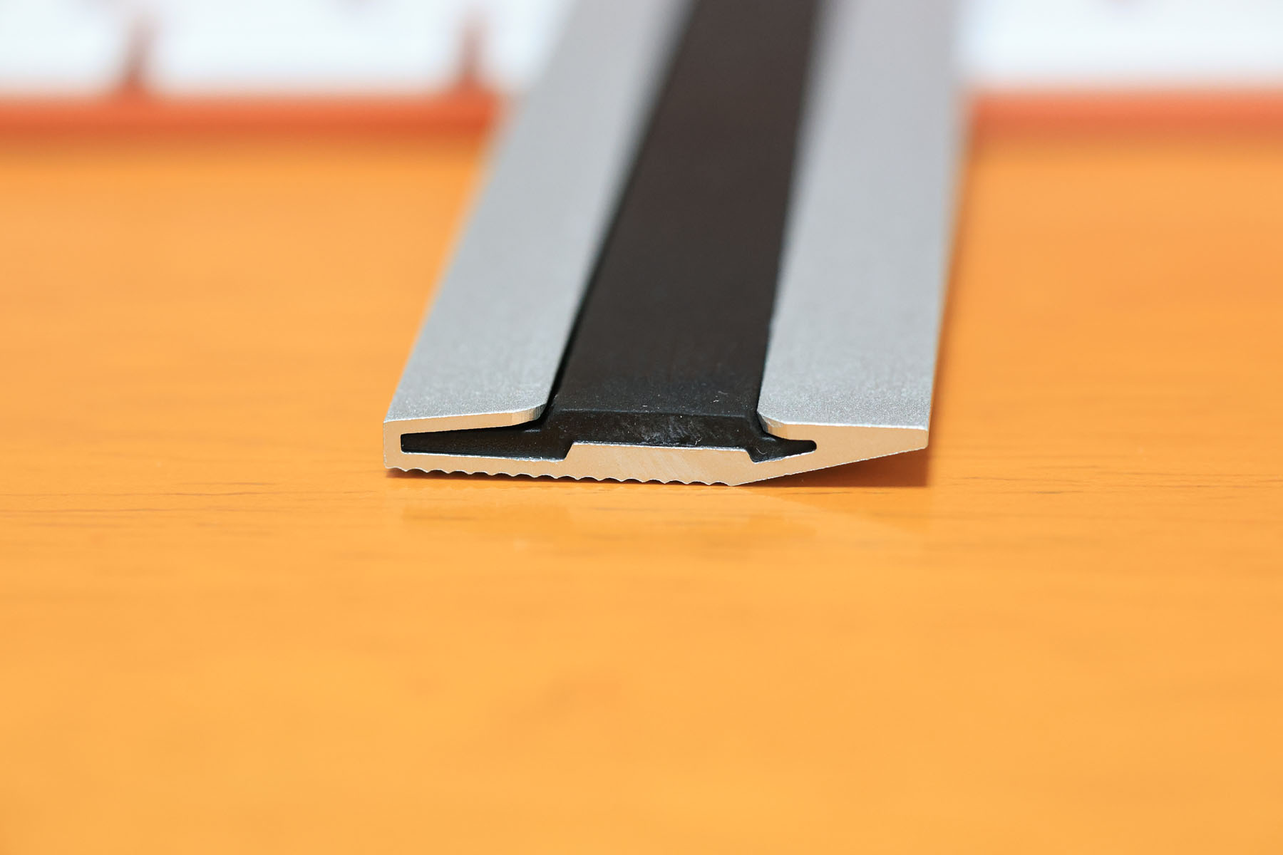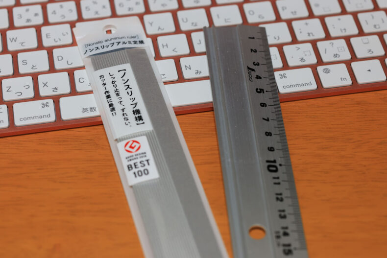 カッターを使うときはシンワのアルミ定規(下の写真右)を使っていたのですが、アルミだけによく滑って位置が定まらず切りにくいことがあるんですね。そしたらノンスリップ構造のものがあることを知り早速買ってみました。グッドデザイン賞受賞のものらしいです。