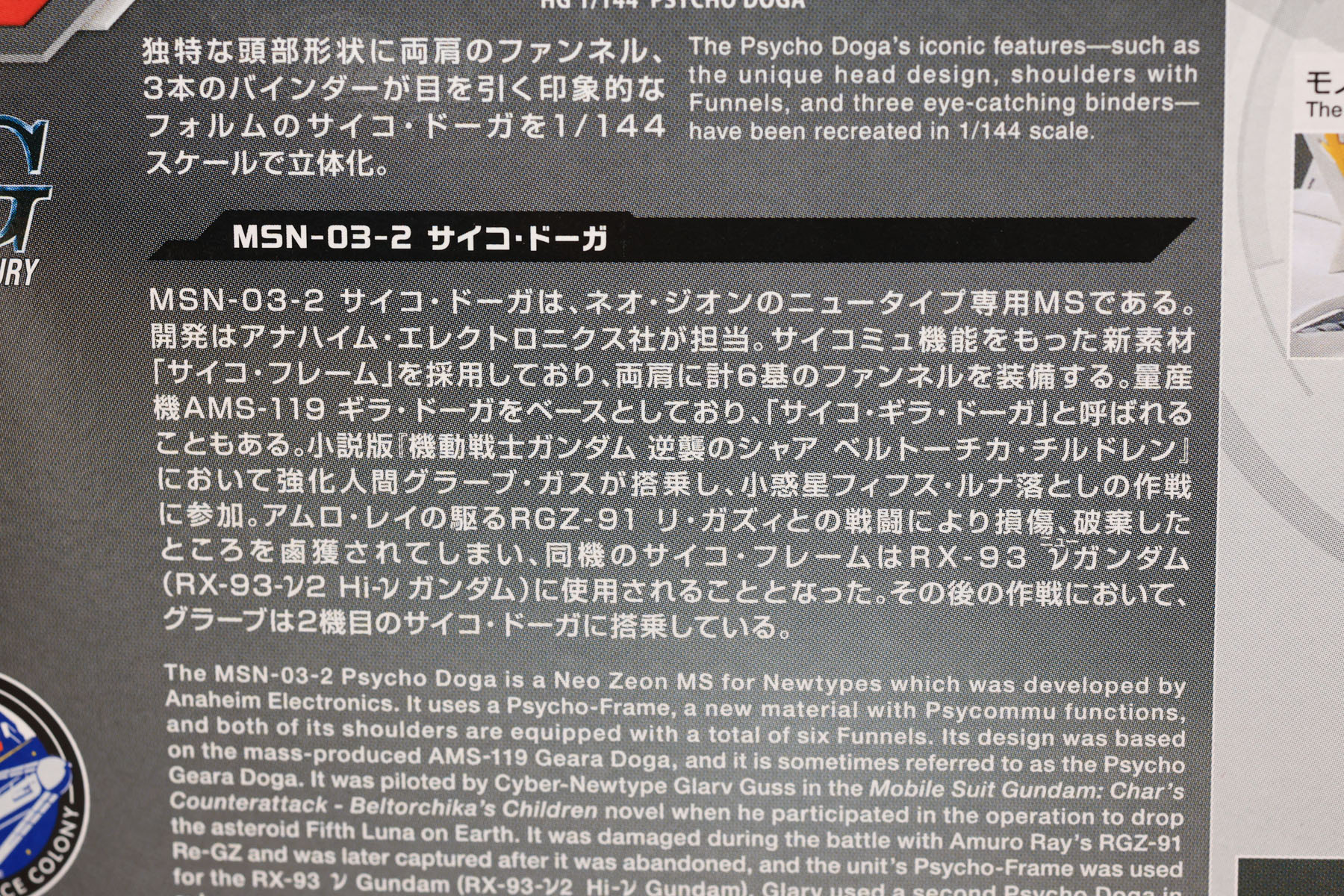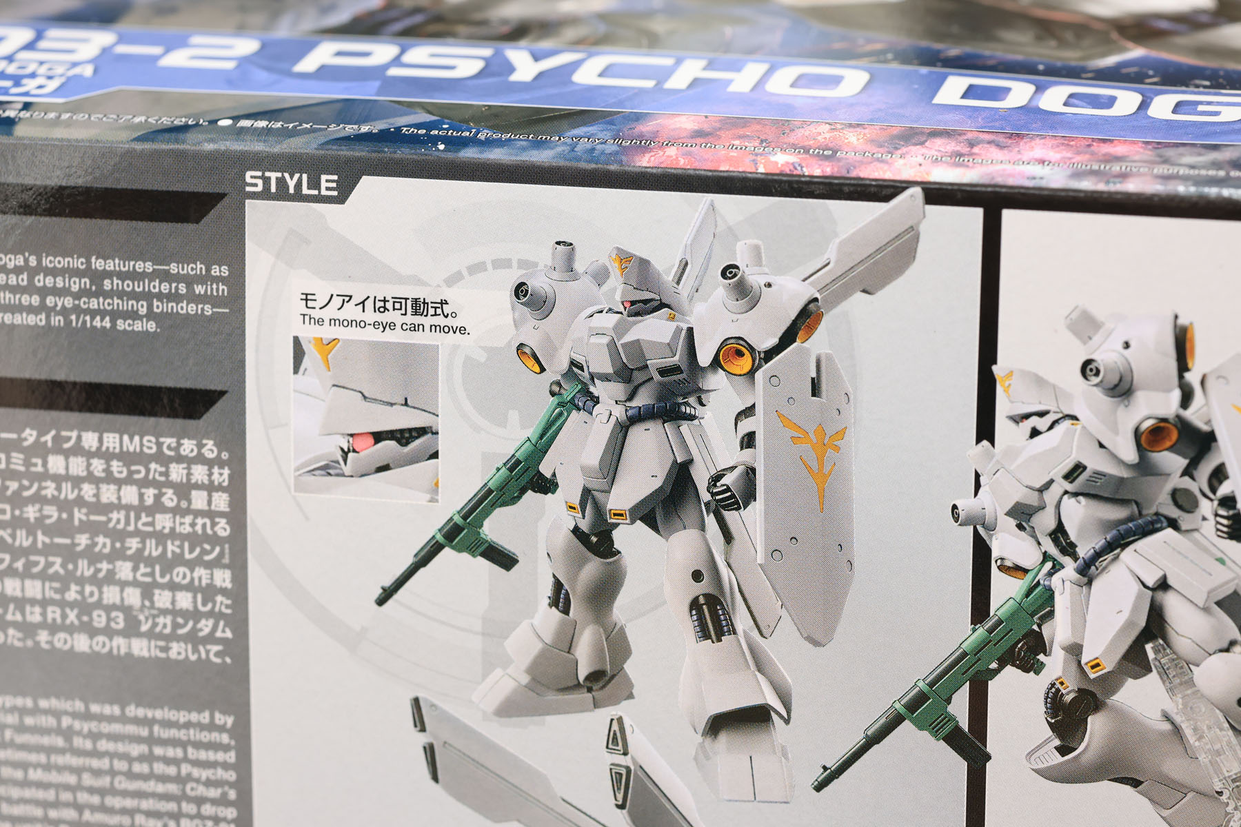 プレバンから福岡先行発売されていたサイコ・ドーガが届きました。宇宙世紀にはサイコ・ドーガという機体は2種類あって、α・アジールに繋がる30m級の大型モビルルーツ NZ-222 型と、MS-06Fザクの系譜を継ぐモデル、ギラ・ドーガ AMS-119 型のニュータイプ/強化人間用のバリエーション MSN-03-2 型があり、このプラモデルは後者のものです。