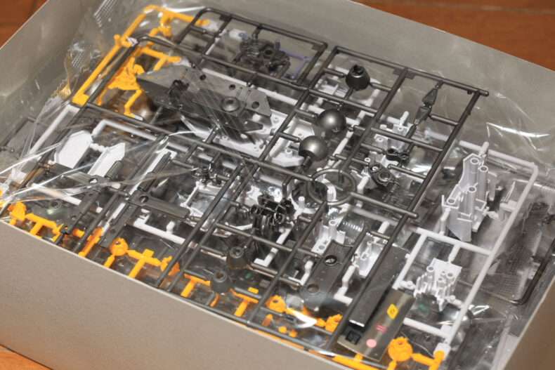 それにしてもやけに分厚い箱に入っていますが…パーツを見ても体積を取るような部品は特になし。HGなのでそんなにパーツ分割が多いというわけでもなし。