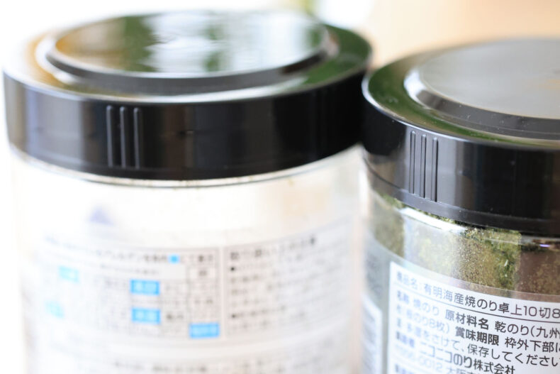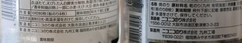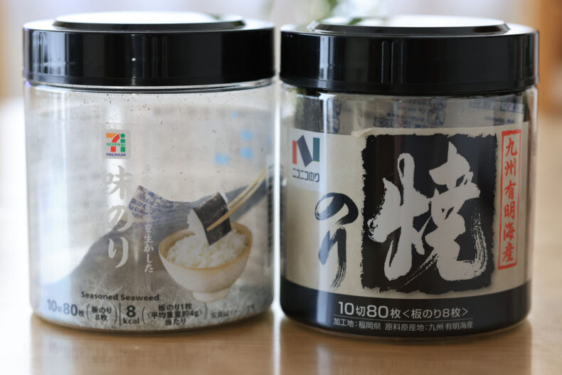 結構な割合でセブンブランドの味のり(下の写真左)を食べていたんですけど、のりは韓国産でお値段は298円+税。でもずっと気になってた、「もっと高いのり」を食べてみたくなり、右の同じ枚数で同じ容器で同じ製造元でお値段が498円+税のものを買ってみました。高い方は有明産のりを使っているようです。