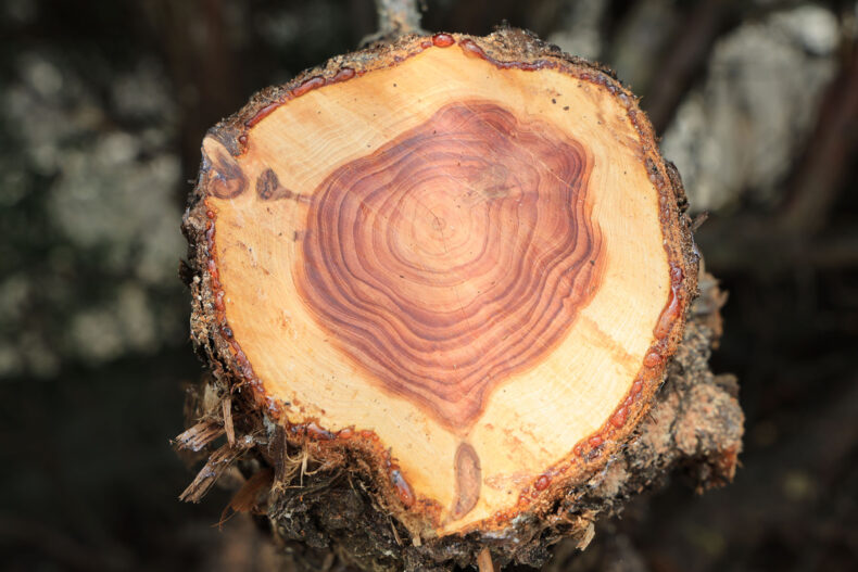 見積に来た植木屋さんには「これ、樹齢50年くらいになるんじゃないですか?」と言われて「まさかぁ」と思ったのですが、年輪を数えたら本当に樹齢50年くらいありそうです。でもこの家が分譲地に建ってから24年。上の切り口の写真の中心付近の色の濃い部分が別のどこかで栽培されていた頃の年輪で、外側の明るい黄色の部分がこの土地に植樹されてからのものなんでしょうね。