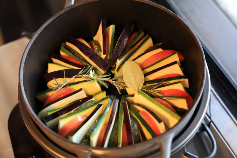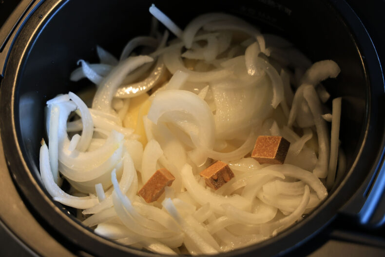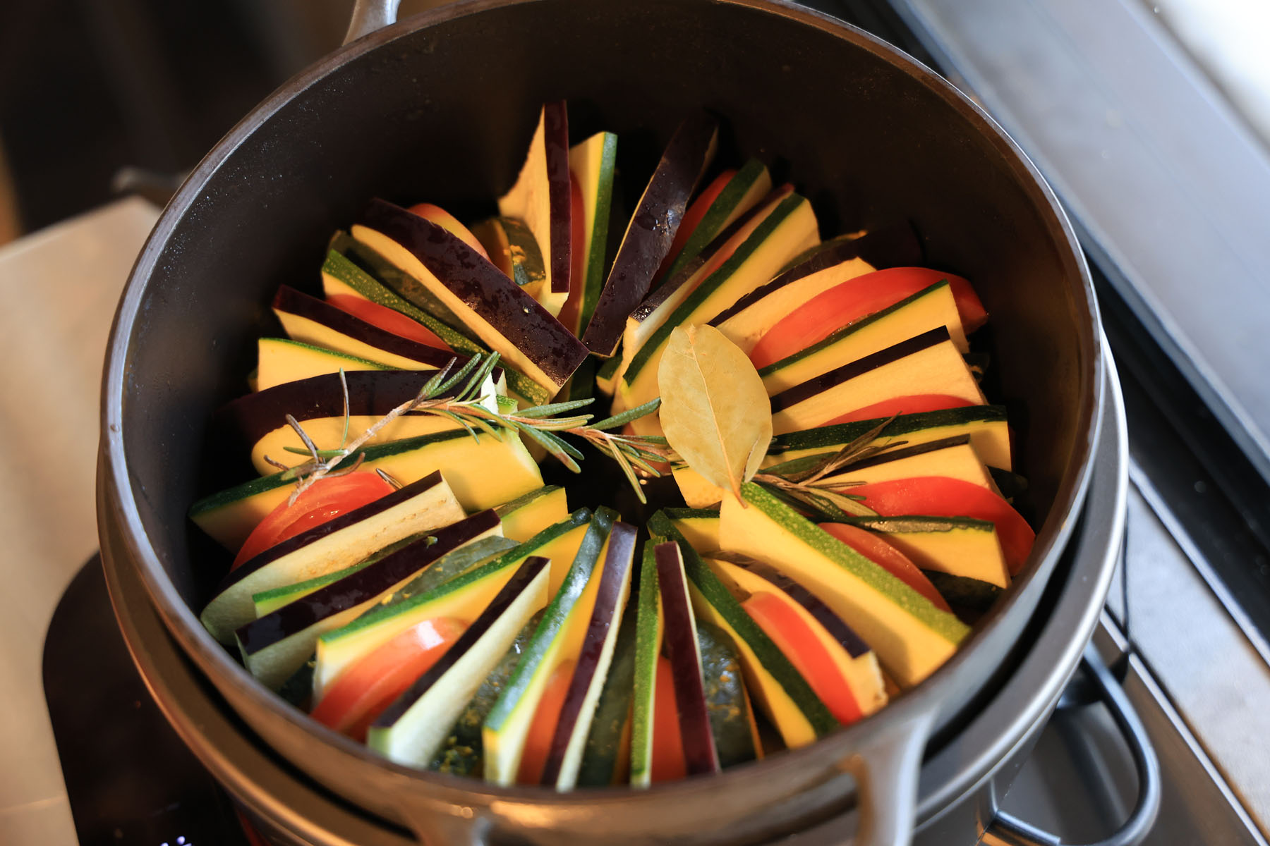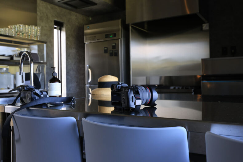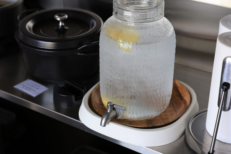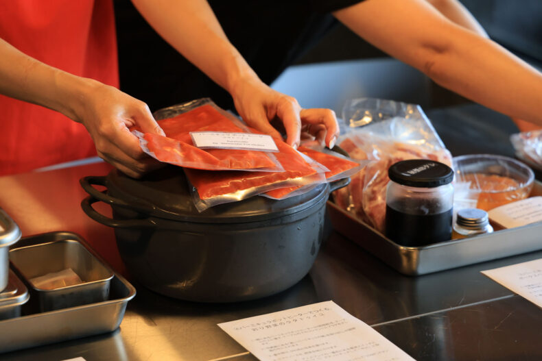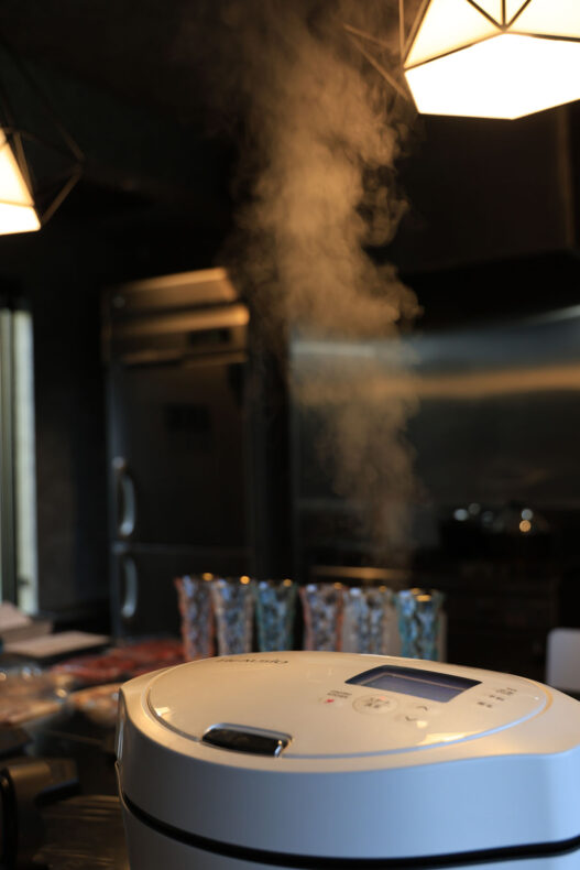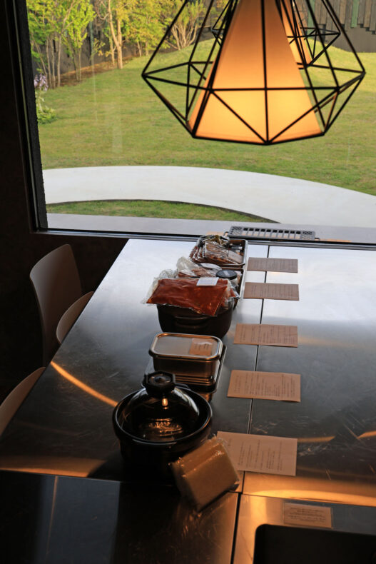 明るいうちは庭と眺めと静けさを満喫し、少し暗くなってきたらお風呂やサウナに入ってもいいし、食事の準備を始めてもいいでしょう。ただ調理をするので、お風呂は後回しの方がいいかも知れません。この日は特別に連泊用のメニューで、六本木「豚組」が仕込んだ肉料理が用意されていました。「ヘルシオ・ホットクック」や「焼肉用 溶岩プレート」など、私にとって初めてとなる調理機材もありました。