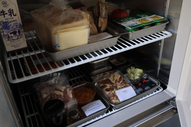 いったん並べてみて、材料に科不足ないか確認します。ちなみに計量カップとごはんのしゃもじがありませんでしたが、そこを乗り切るのもキャンプ的です(笑。この時間になるとスタッフさんは常駐していないので、「計量カップがないよ〜」と呼んでもタイムリーには駆けつけられません。何とかしましょう。この宿をリザーブするような方はそれくらい乗りきれると信じています。