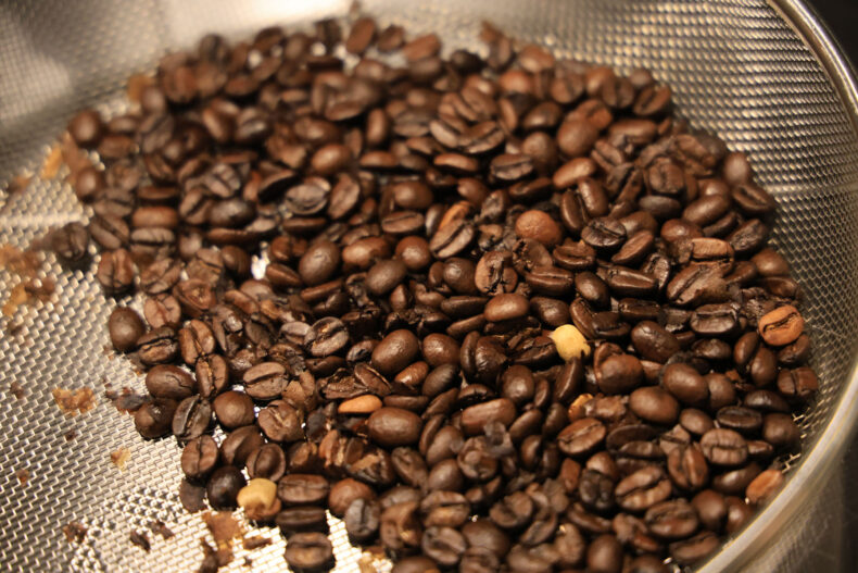セブンイレブンなどで見たことのある豆の見た目になったら、ざるにあけて冷まし翌朝を待ちます。いやぁ豆の焙煎って初めてやりましたが、こんな感じなんですね。