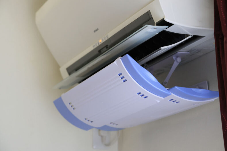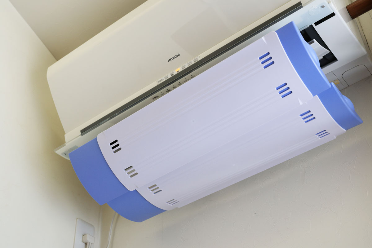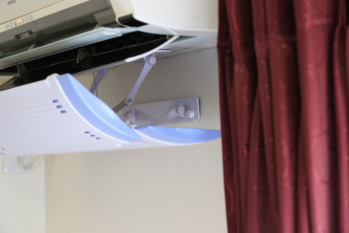 1枚目と干渉するのでエアコン本体には取り付けできず、壁にピン留めする小道具を使ってピンで壁に固定しました。これです: