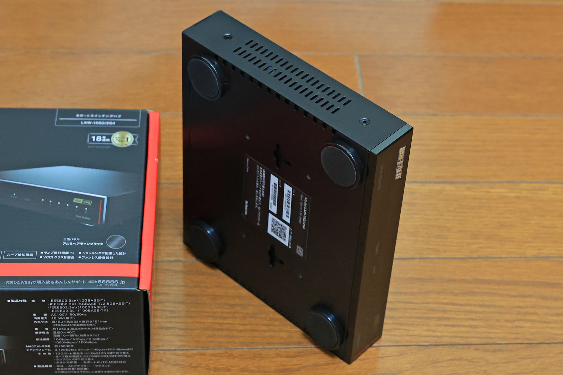 オーディオ装置ばりにインシュレーター風の脚を付けたんだそうです。この製品、10G LANを家庭に普及すべく作られた製品らしいんですが、その割には「安く作ろう」という意識が控えめで、妙にお金がかかっています。重量も1Kg越えで、このサイズのハブとしてはびっくりするくらい重いです。